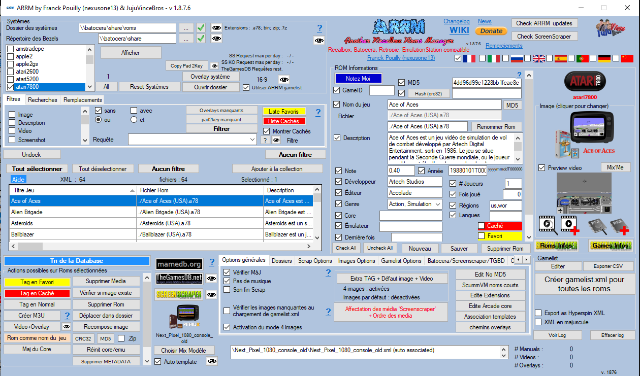 Some features ARRM is a Scraper : It allows you to retrieve and format (scraper) textual information and graphic media from video games by querying sites offering this information (Screenscraper, HFSDb, TheGamesDb.net, LaunchBox, Steam, GOG) It can thus create gamelist.xml files compatible with many retrogaming distributions (Recalbox, Batocera, Retropie, EmuElec, RetroBat …) and allows, via exports, to create files compatible with other distributions (Pegasus, AttractMode , Hyperspin) and .csv files ARRM is a gamelist manager : It allows you to manipulate the recovered data: filter, sort, delete, edit, clean, replace data … Many built-in utilities allow you to best customize your gamelists and scrapes ARRM retrieves scrape information from the following databases: ScreenScraper, Launchbox HFS-DB, Steam, GOG TheGamesDb.net Tutorial Videos Playlist Youtube Videos Tutorials or Videos Tutorials Wall View Some functionalities (click) See the Changelog For more information consult the WIKI ARRM Tutorial videos accompany the WIKI and will help you get started with ARRM. Download ARRM (full version with installer) Download ARRM without installing allowing to install or update the application Download Betas / Corrections |