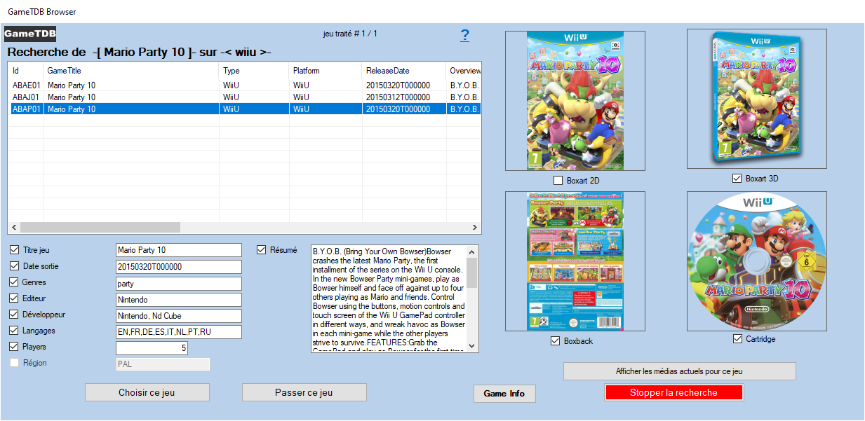 When you select a line containing a result, the media found on GameTDB is displayed on the right. found media checkboxes are automatically checked. You can uncheck the media and textual information that you do not want to recover.