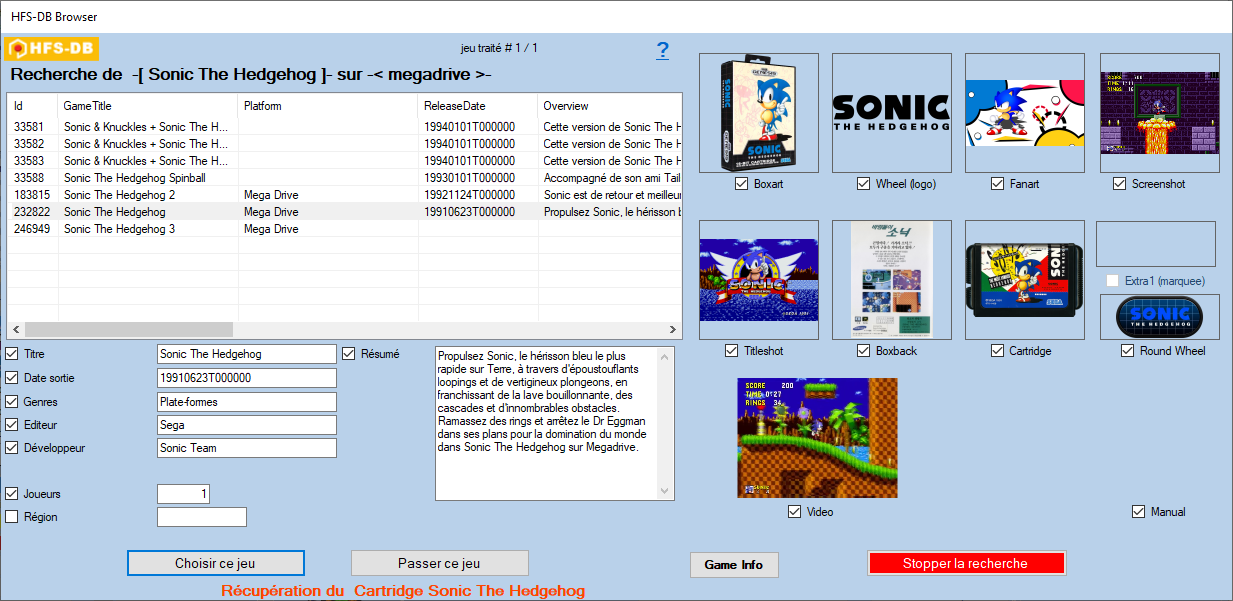 When you select a line containing a result, the media found on HFS-DB is displayed on the right. The found media checkboxes are automatically checked (video and manual as well). You can uncheck the media and textual information that you do not want to recover.