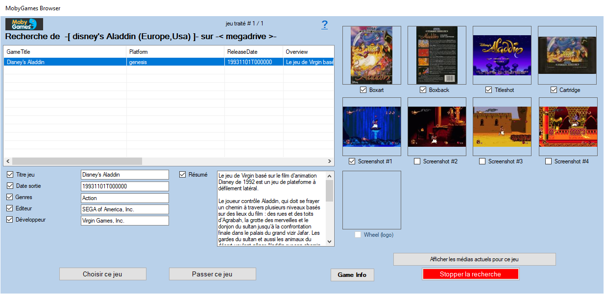 When you select a line containing a result, the media found on MobyGames is displayed on the right. The found media checkboxes are automatically checked. You can uncheck the media and textual information that you do not want to recover.