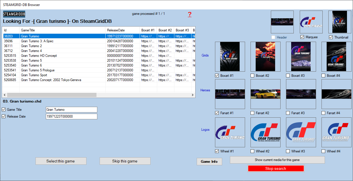 When you select a row containing a result, the media found on SteamGridDB is displayed on the right. The checkboxes of the media found are automatically checked (video and manual as well). You can uncheck the media and textual information that you do not want to recover.