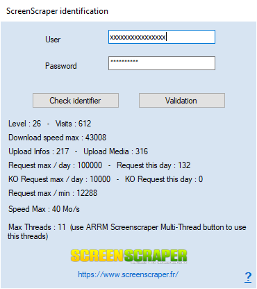 - Login Screenscraper (button): Displays a popup allowing you to enter your username/password on screenscraper. It is preferable (but not mandatory) to create an account on Screenscraper.fr because the latter favors registered users during scraps.