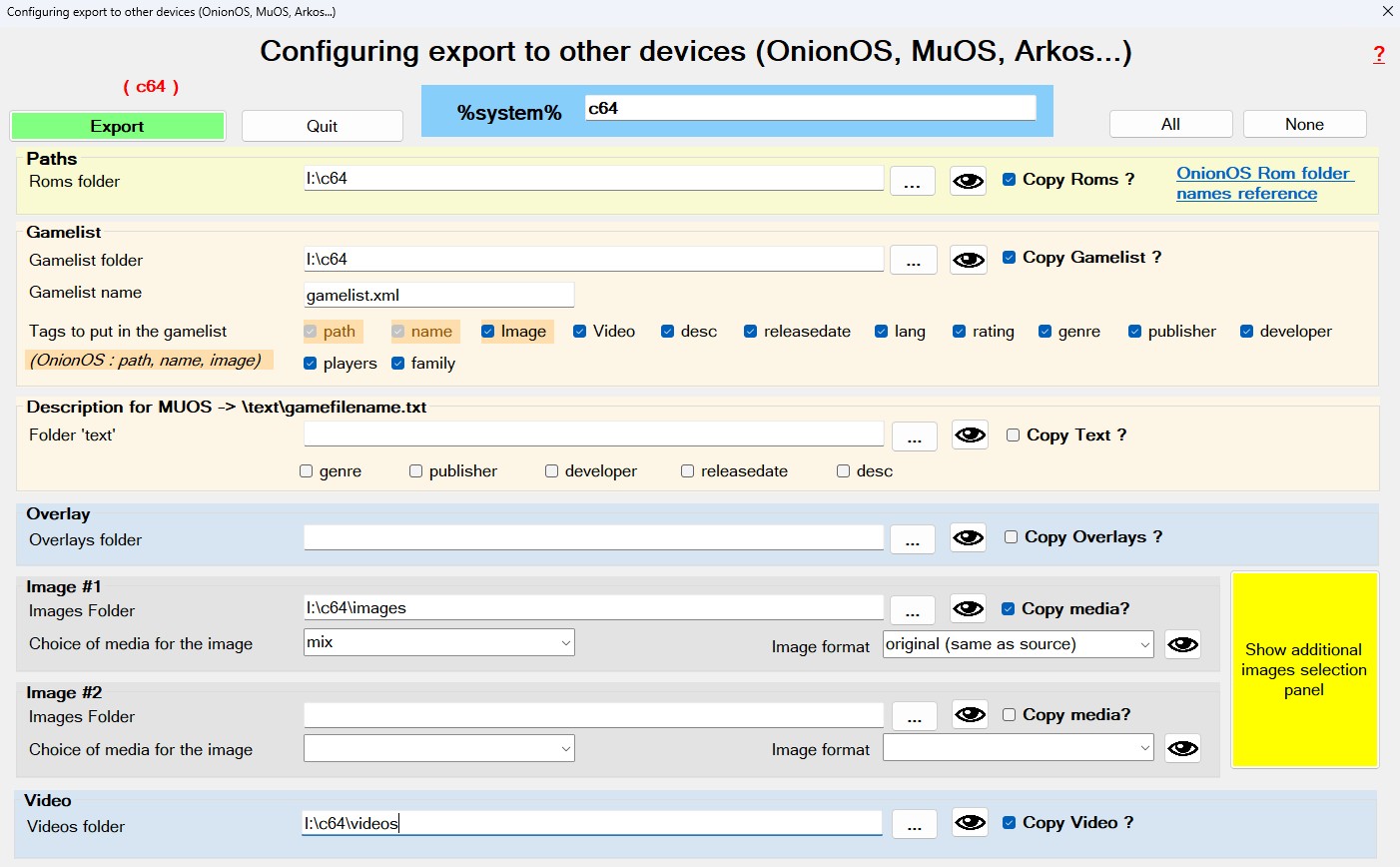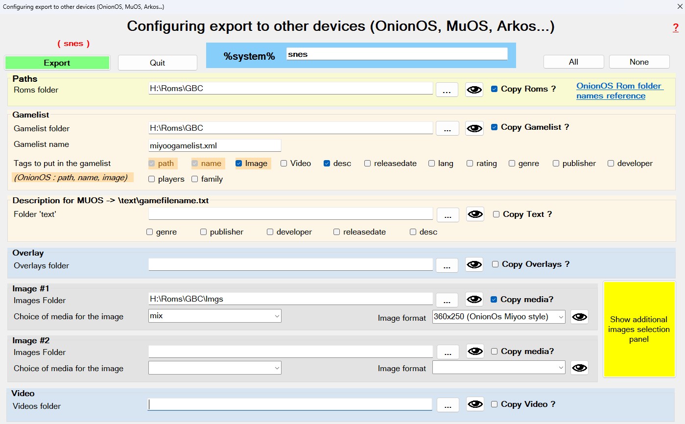 - Images' folder : indicate the folder in which your destination system stores the games' media. For example: OnionOS stores media in the Imgs directory (respect case) located in the Roms folder.