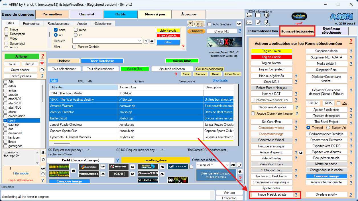Pour appliquer un script à des ROMs contenant déjà des médias, sélectionnez vos ROMs et cliquez sur le bouton Scripts Image Magick dans l'onglet ROMs sélectionnées.
