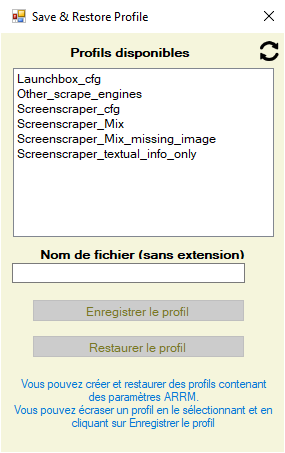 - Créer un nom de profil (sans extension) et cliquer sur Enregistrer le profil (Tous les paramétrages actuels d'ARRM seront sauvegardés)