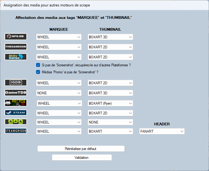 Ce formulaire est accessible via le bouton Affectation des media pour autres moteurs de scrape dans l'onglet Options générales. Il permet d'affecter au tag THUMBNAIL et MARQUEE un des éléments récupérables sur le moteur de scrape désigné.