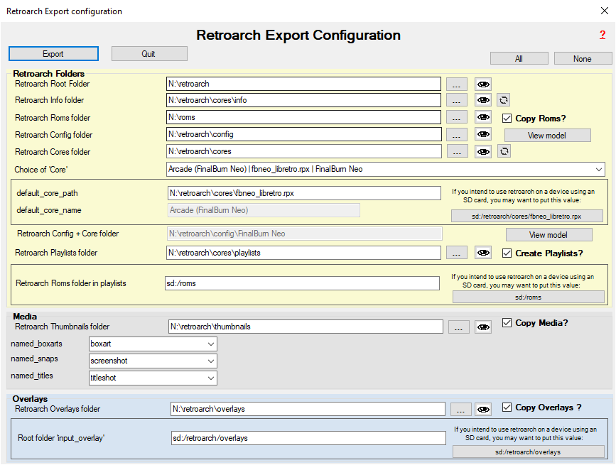 After clicking on the Export to Retroarch button located in the Selected Roms tab, the settings module appears:
