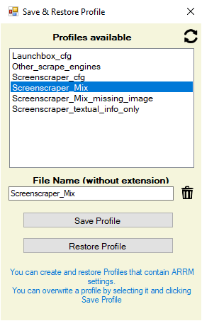 The yellow information that appears below this button indicates the last profile loaded. Here: Screenscraper_Mix