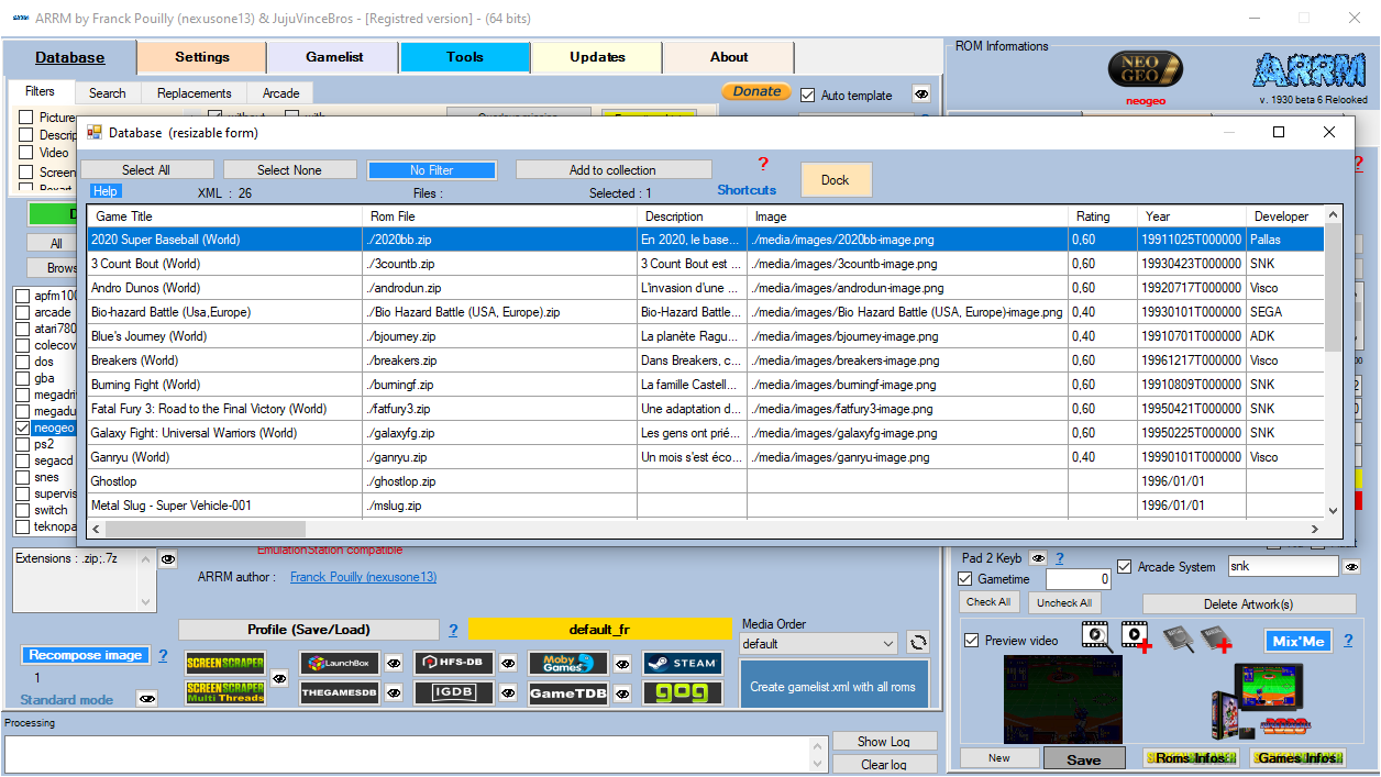 This window that I call the Database contains the information that will be written in the gamelist.xml when saving/creating it. Some fields are editable, but it is better to go through the 'Rom Information' panel which applies input controls.