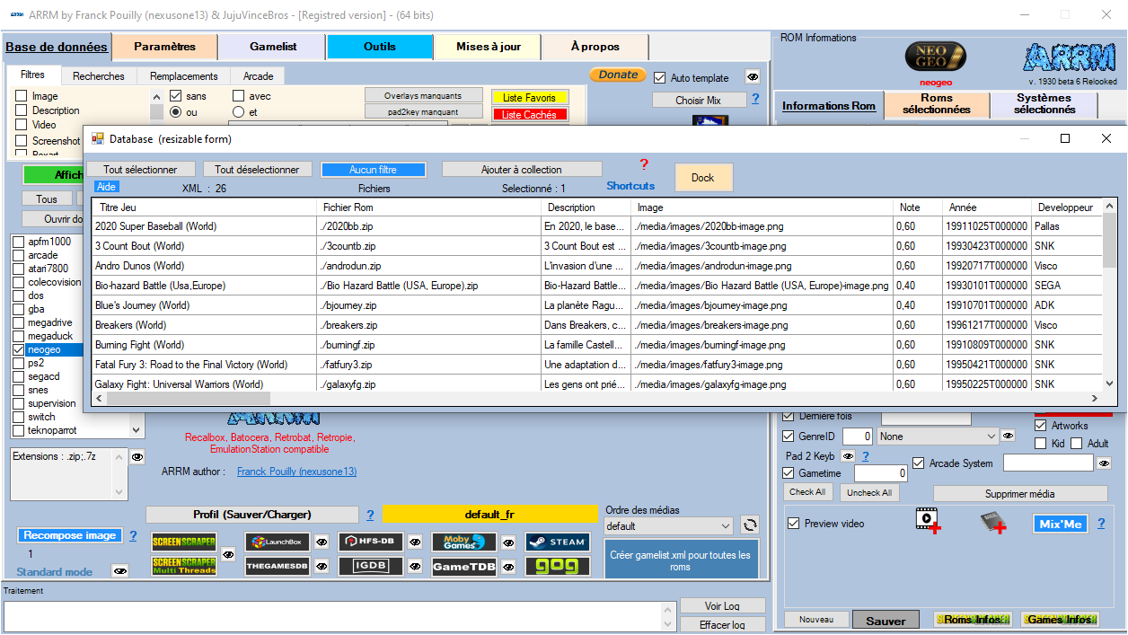 Cette fenêtre que j'appelle la Database contient les informations qui seront écrites dans la gamelist.xml lors de sa sauvegarde/création. Certains champs sont éditables, mais il est préférable de passer par le panel 'Rom Informations' qui applique des contrôles de saisie.