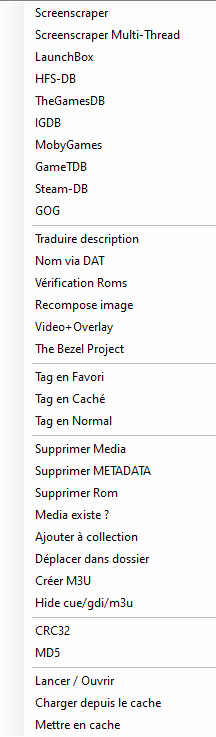 Vous pouvez accéder à un menu contextuel en sélectionnant ou une plusieurs roms et en faisant un click droit. Cela vous permet d'accéder à certaines fonctions sans avoir à passer par les menus Actions de droite