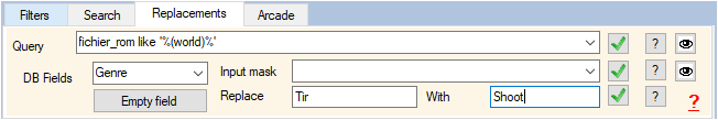 This will replace in the DB fields Genre (genre_rom) the string 'Tir' by 'Shoot'