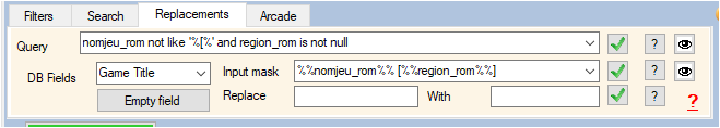 fichier_rom like '%(USA)%' nomjeu_rom not like '%[%' and region_rom is not null boxart_rom<>'' and favoris_rom=true and rating_rom > 0.2 nomjeu_rom like '*zelda*' and map_rom is null favoris_rom=true and (image_rom is null and manual_rom<>'') len(description_rom) < 10 substring(nomjeu_rom,1,2) = '19'