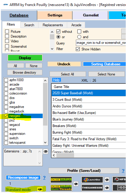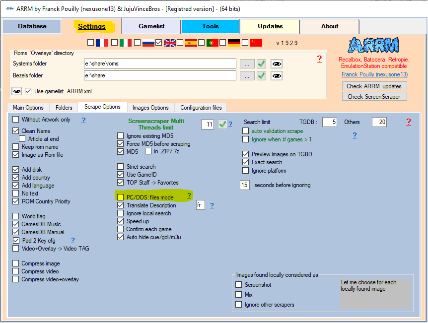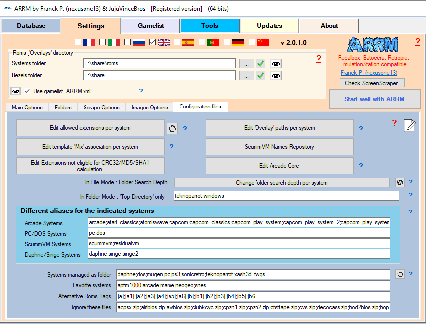 If for some systems you only want to search for files in the first directory (Top Directory Only) without going to subdirectories, you can indicate the name of these systems in the file top_directory_only_list.txt located in %appdata%\Nexouille soft\arrm\database\