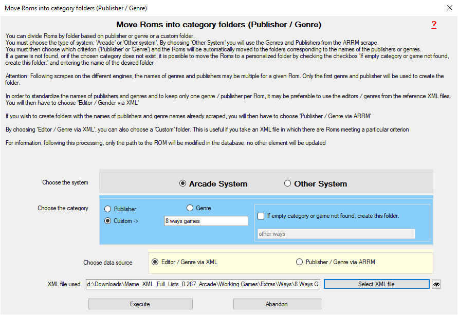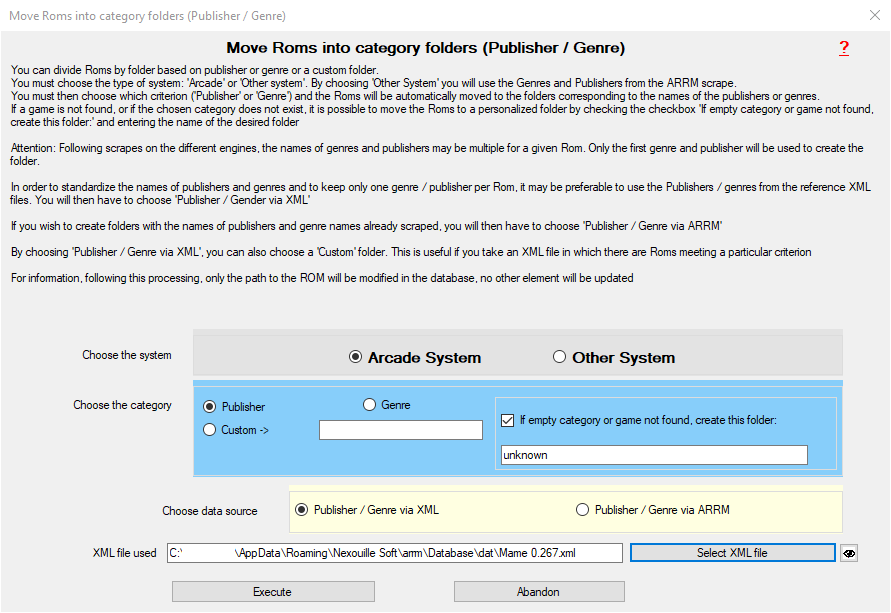 - XML file used : In the case of the source choice: Publisher / Genre via XML, ARRM will use the information from the XML file indicated to retrieve the publisher and the genre or to move the Roms to the folder indicated in Custom →