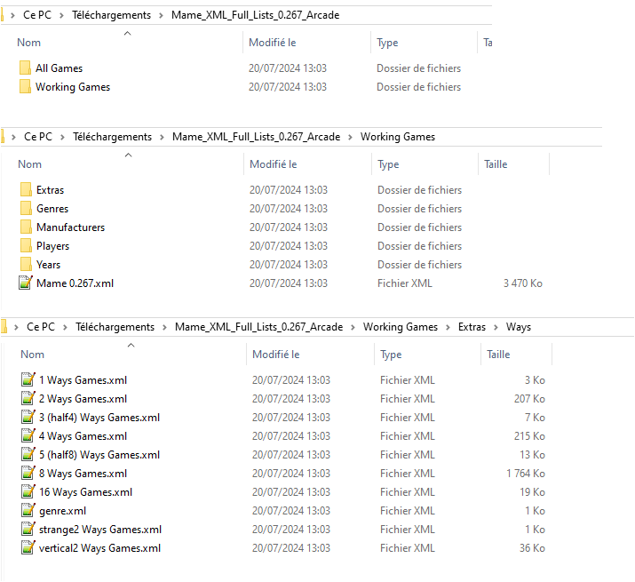 Let's take as an example the file Mame_XML_Full_Lists_0.267_Arcade.zip that he offers on his site. By unzipping it we obtain this tree structure.