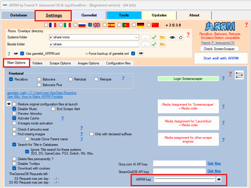 - In the Settings, then General Options tab, enter the key in the ARRM key textbox