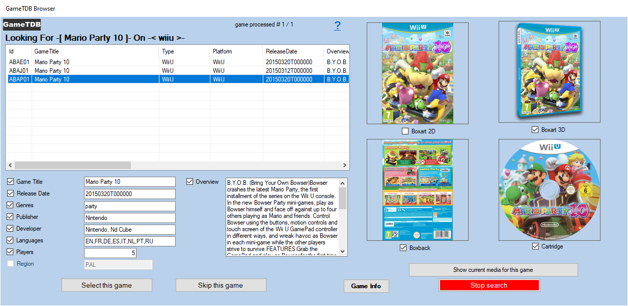 When you select a line containing a result, the media found on GameTDB is displayed on the right. found media checkboxes are automatically checked. You can uncheck the media and textual information that you do not want to recover.