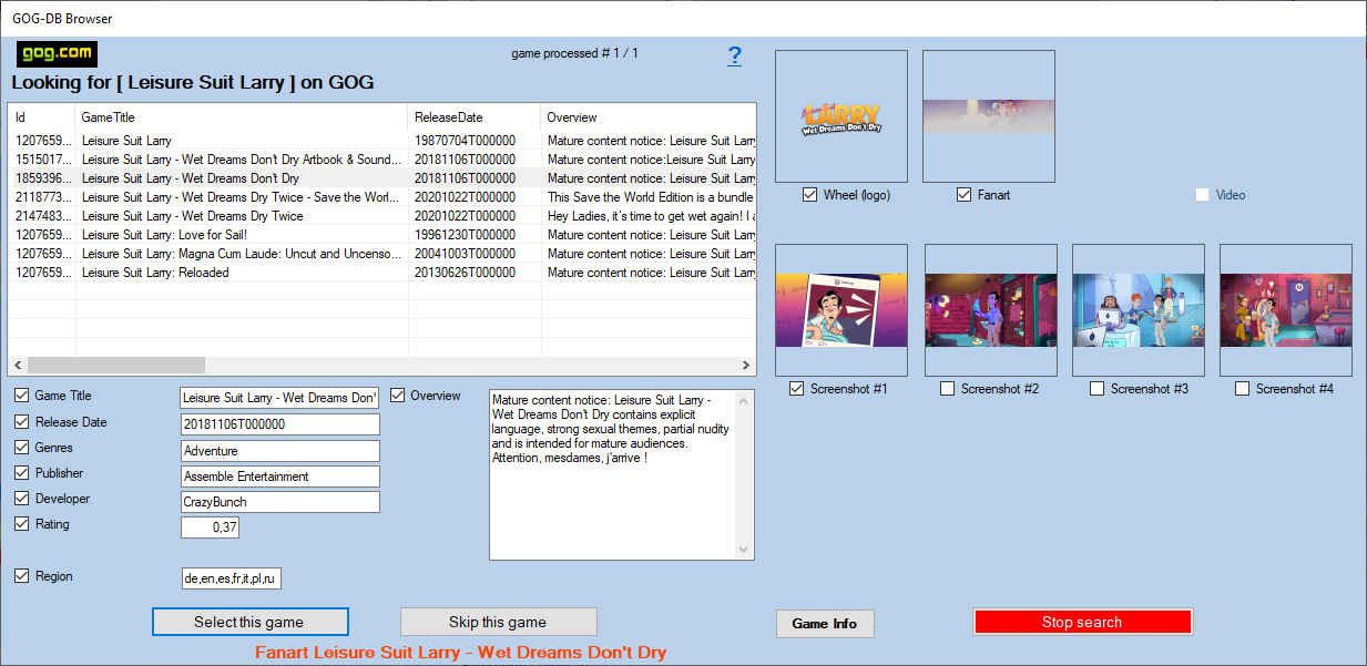 When you select a line containing a result, the media found on GOG is displayed on the right. The found media checkboxes are automatically checked. You can uncheck the media and textual information that you do not want to recover.