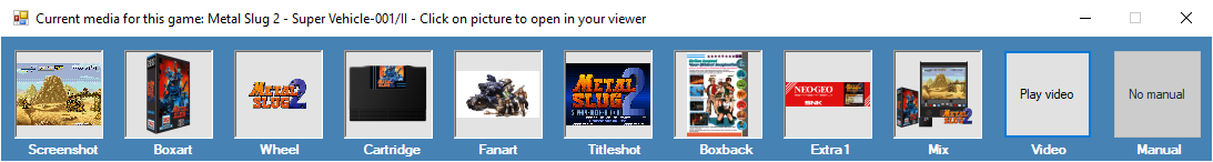 - Default Image + Video (button): (Since version 1.9.0.2 Beta 15) When a scraper finds a ROM but the media Boxart, Screenshot, Cartridge, Wheel and Video are missing, it is possible to display a substitute image/video. To do this, check the Activation of default images checkbox.
