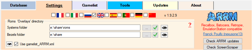- Use ARRM gamelist (checkbox): when a gamelist.xml is created by ARRM, ARRM creates a gamelist_ARRM.xml copy containing all the tags offered by ARRM. When choosing a system, if the use ARRM gamelist checkbox is checked, ARRM will use this gamelist_ARRM.xml file and not the gamelist.xml file that may have been modified by the frontend. ARRM will replace the contents of the gamelist.xml file with those of the gamelist_ARRM.xml file. This prevents loss of ARRM custom tags that may have been deleted by the frontend. This is useful for someone who revisits gamelists to perform, for example, image recomposition or other manipulations offered by ARRM. Otherwise, this shouldn't pose any problems.