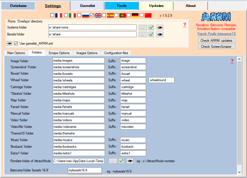 - ARRM Folders Exclusion since 2.0.2.3 beta 3 : When saving the gamelist.xml, the ARRM Folders checkbox will not apply to the indicated systems (separated by a by a semicolon). This allows, by ignoring custom folders, to speed up the creation of the gamelist on systems containing many subfolders, such as Windows, PS3, Teknoparrot etc…