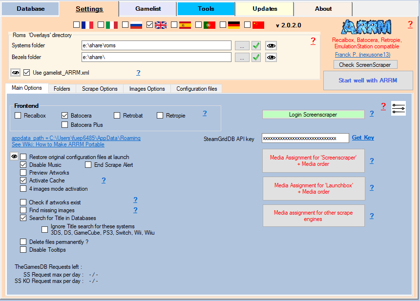 - Batocera (checkbox): Check if you use Batocera. Used for certain specificities of this system (management of certain systems, core list, stop/start script, management of overlays, etc.)