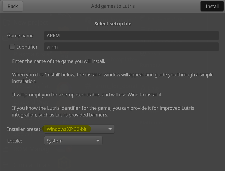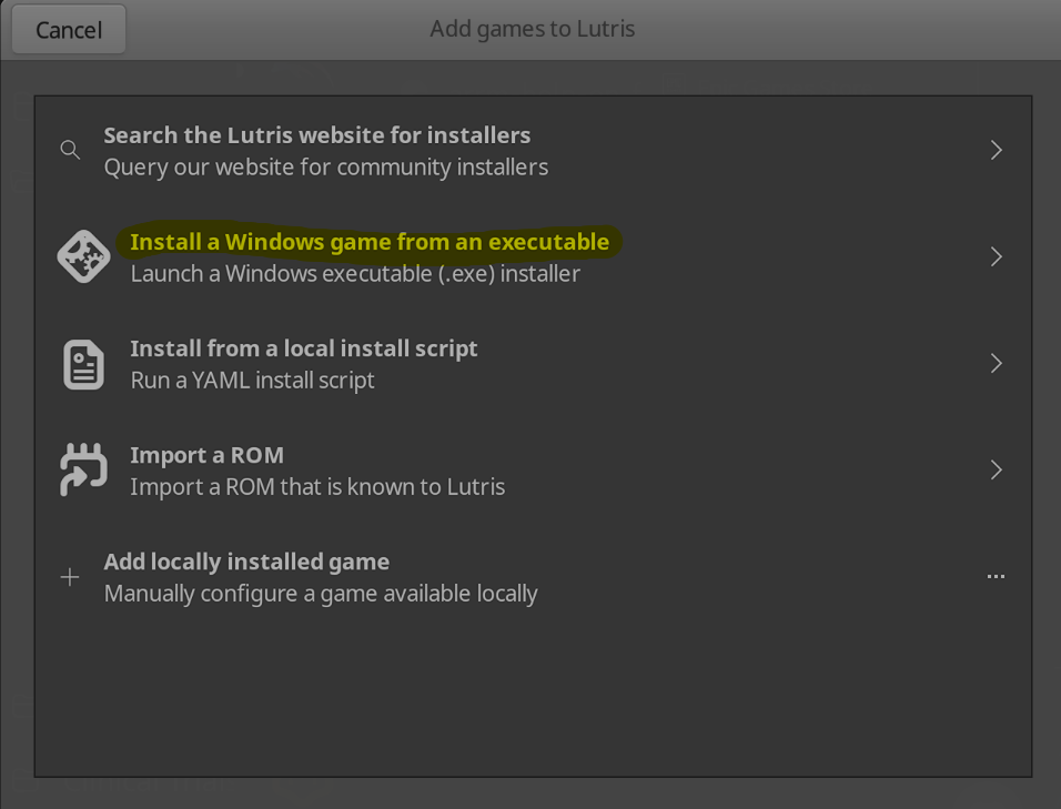 - Add a new game to Lutris, puis sélectionnez l'option d'installation depuis un exécutable.