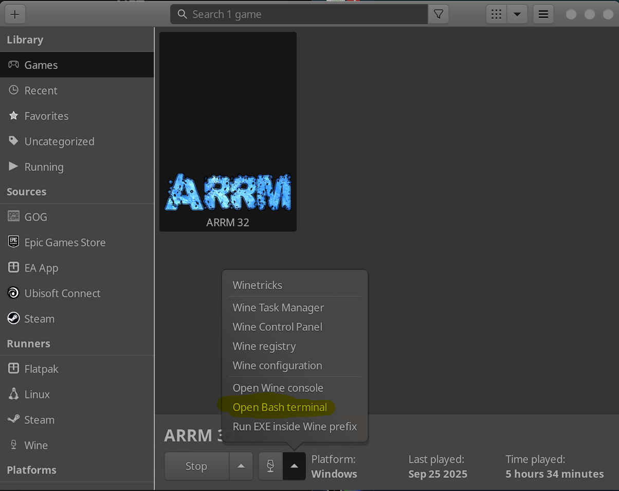 - Ensuite, j'ai dû exécuter quelques commandes Winetricks. Le moyen le plus simple (étant donné les différentes méthodes d'installation de Lutris) est d'ouvrir un terminal bash.