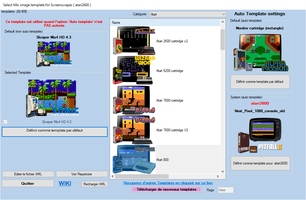 Cet écran vous permet de choisir les templates à utiliser. Vous pouvez ici paramétrer trois types de templates : Default (non auto template) , Default (auto template) , System (auto template)