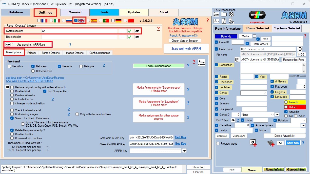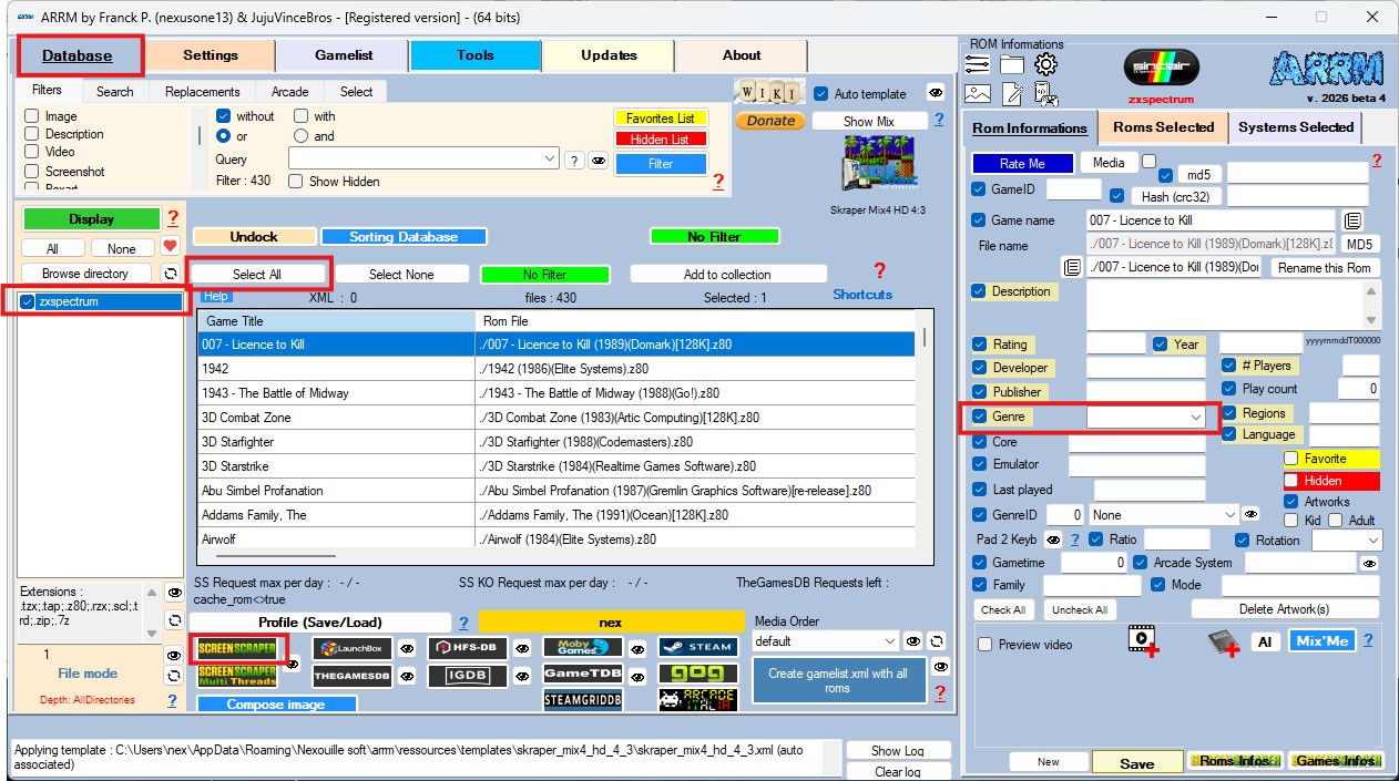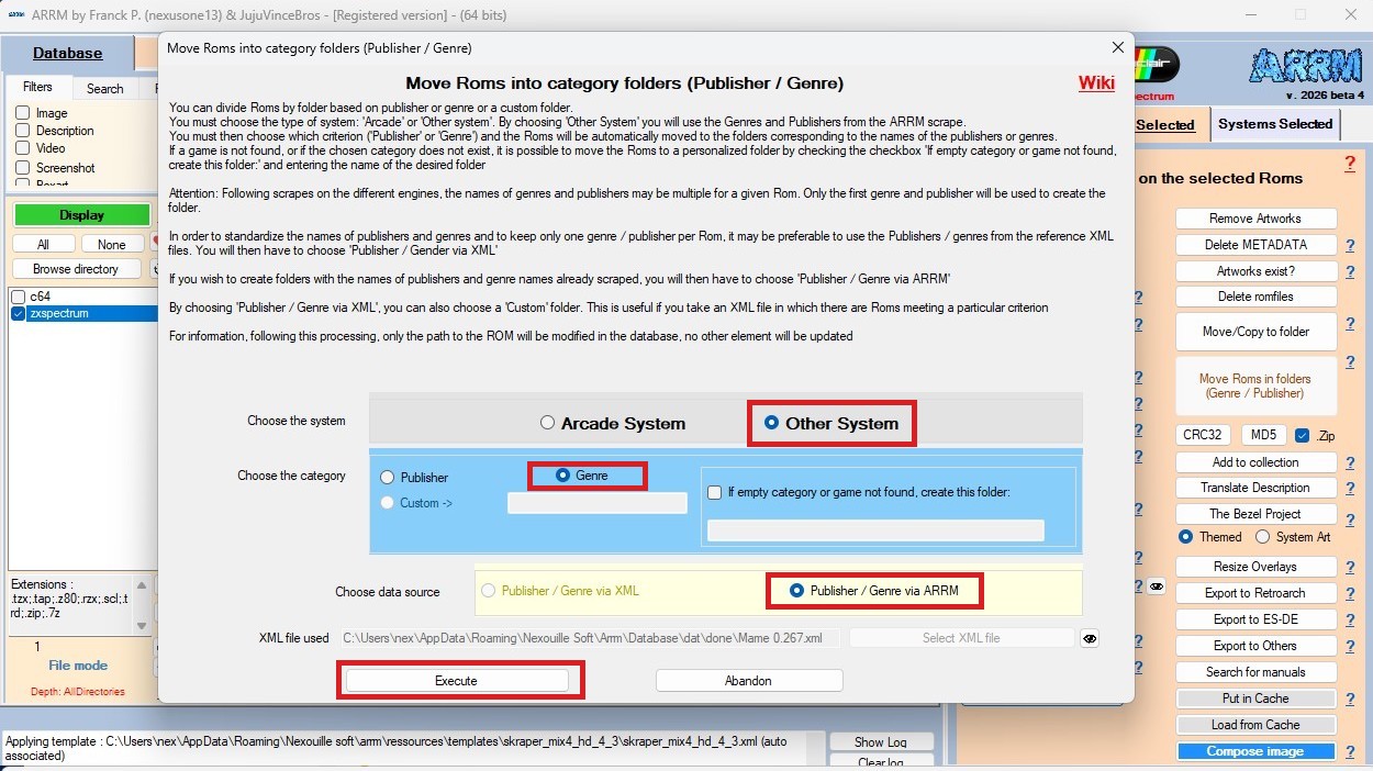 Afin de récupérer le genre du jeu, il va falloir scraper les Roms présentes sur la clé avec ARRM, sans avoir à récupérer les supports, qui à l'heure actuelle, ne sont pas reconnus sur ces systèmes.