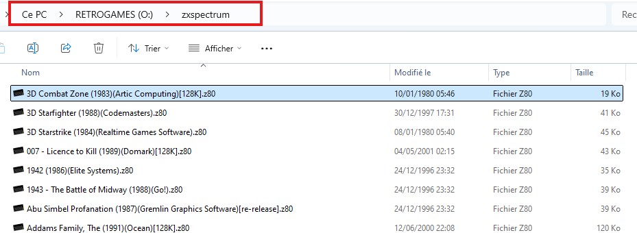 Déplacez tous les éléments contenus dans le dossier O:\zxspectrum (dans notre exemple) vers la racine de votre clé USB O:\