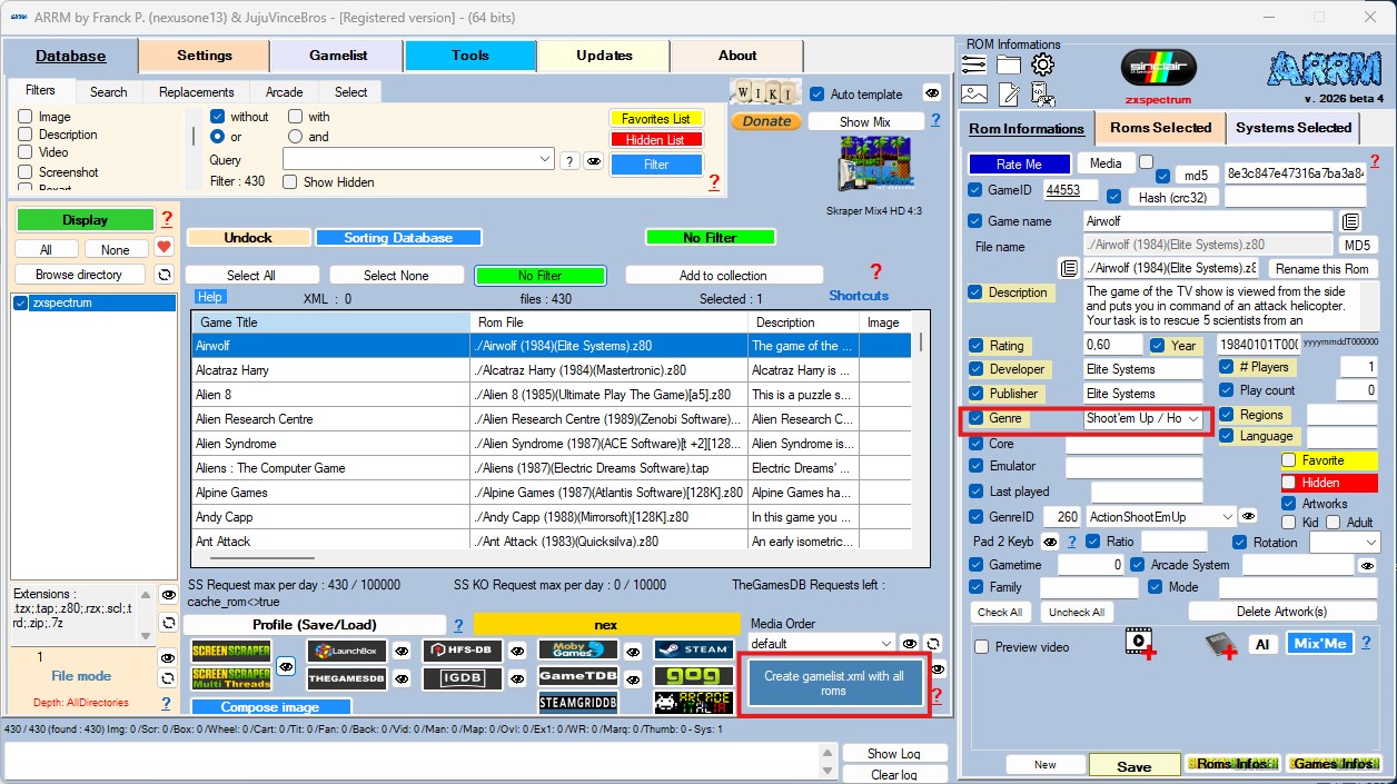 Par sécurité, cliquez sur Créer gamelist.xml avec toutes les roms pour sauvegarder ces informations dans le fichier gamelist.xml situé dans le dossier zxspectrum