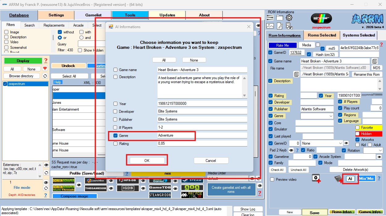 Positionnez-vous sur la Rom sans genre et cliquez sur le bouton IA dans le panneau Informations Rom.