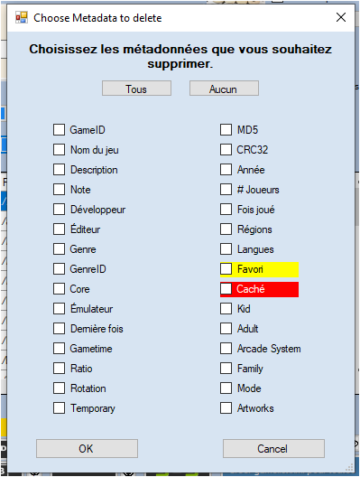 Il est possible de supprimer (mettre à blanc) toutes ou partie des METADATA (champs de la gamelist). Utile si vous souhaitez par exemple, remettre à 0 le nombre de fois joué ou la date de la dernière partie.