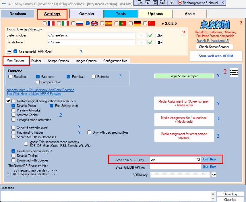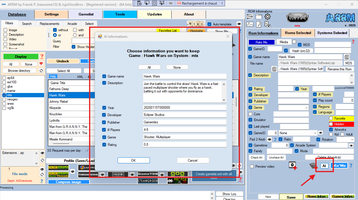 Notez Moi : Depuis la version 1.8.7.6 Beta 4, il est possible d'attribuer une note à un jeu et envoyer cette note à Screenscraper. Il est nécessaire d'avoir un compte sur Screenscraper et qu'il soit renseigné dans ARRM.