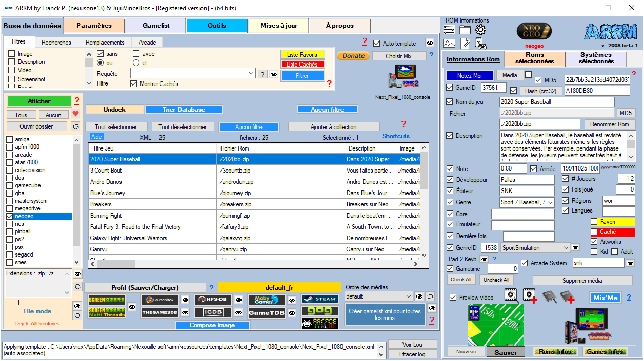 Le database permet d'afficher le contenu d'une gamelist ou du répertoire d'un système sélectionné. Vous pourrez appliquer différents traitements sur les Roms sélectionnées