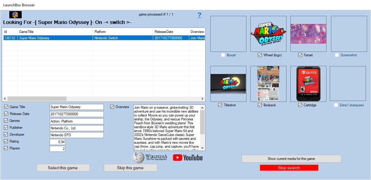 Dans l'exemple ci-dessous, nous avons sélectionné le moteur de scrape Launchbox. Ce moteur de scrape ainsi que Steam, GOG, HFSDb, et TheGamesDB propose une fenêtre de sélection. Seuls les media manquants qui ont été trouvés sur ce moteur seront affichés et accessibles via une checkbox. Faites votre choix, puis Cliquez sur le bouton Sélectionner ce jeu