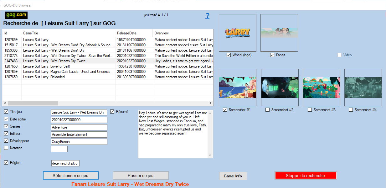 Quand vous sélectionné une ligne contenant un résultat, les medias trouvés sur GOG s'affiche sur la droite. Les checkbox des media trouvés sont automatiquement cochées. Vous pouvez décocher les media et infos textuelles que vous ne souhaitez pas récupérer.