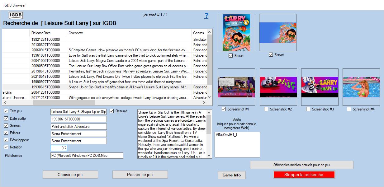 Quand vous sélectionné une ligne contenant un résultat, les medias trouvés sur IGDB s'affiche sur la droite. Les checkbox des media trouvés sont automatiquement cochées. Vous pouvez décocher les media et infos textuelles que vous ne souhaitez pas récupérer.