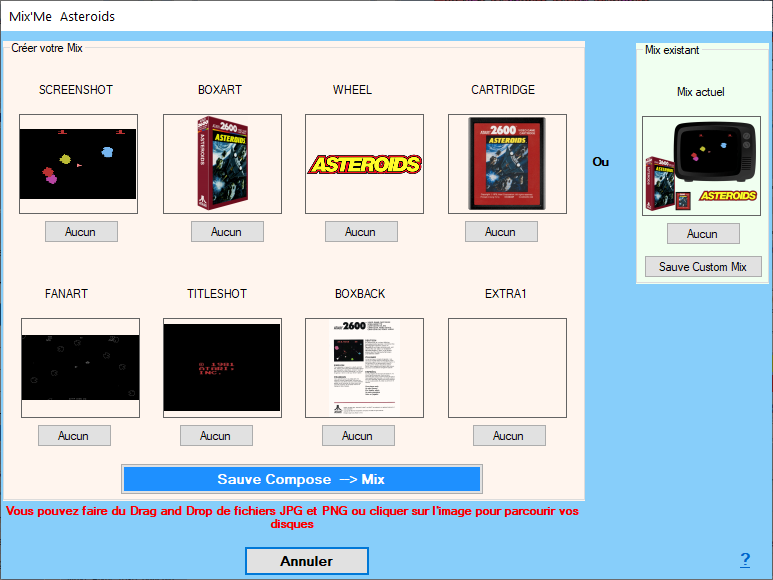 Ecran Mix'Me qui permet de composer son propre Mix en sélectionnant les fichiers images (drag & drop possible depuis les images locales ou sites internet) Il est également possible de choisir une image d'un Mix déjà réalisé.